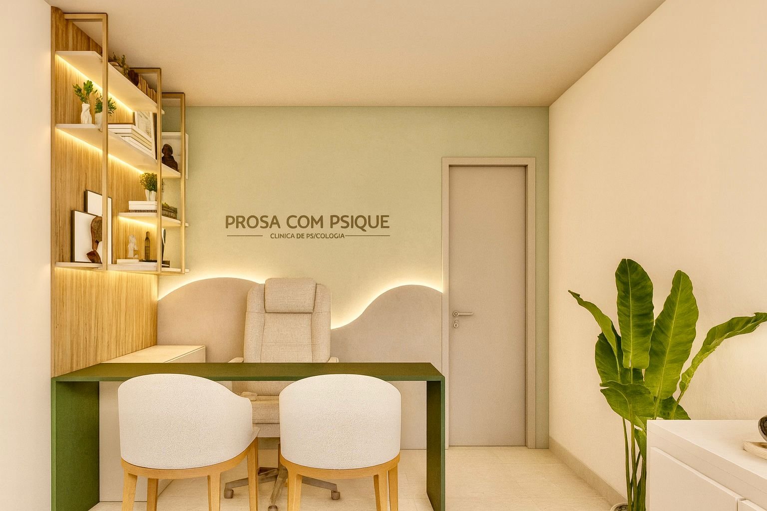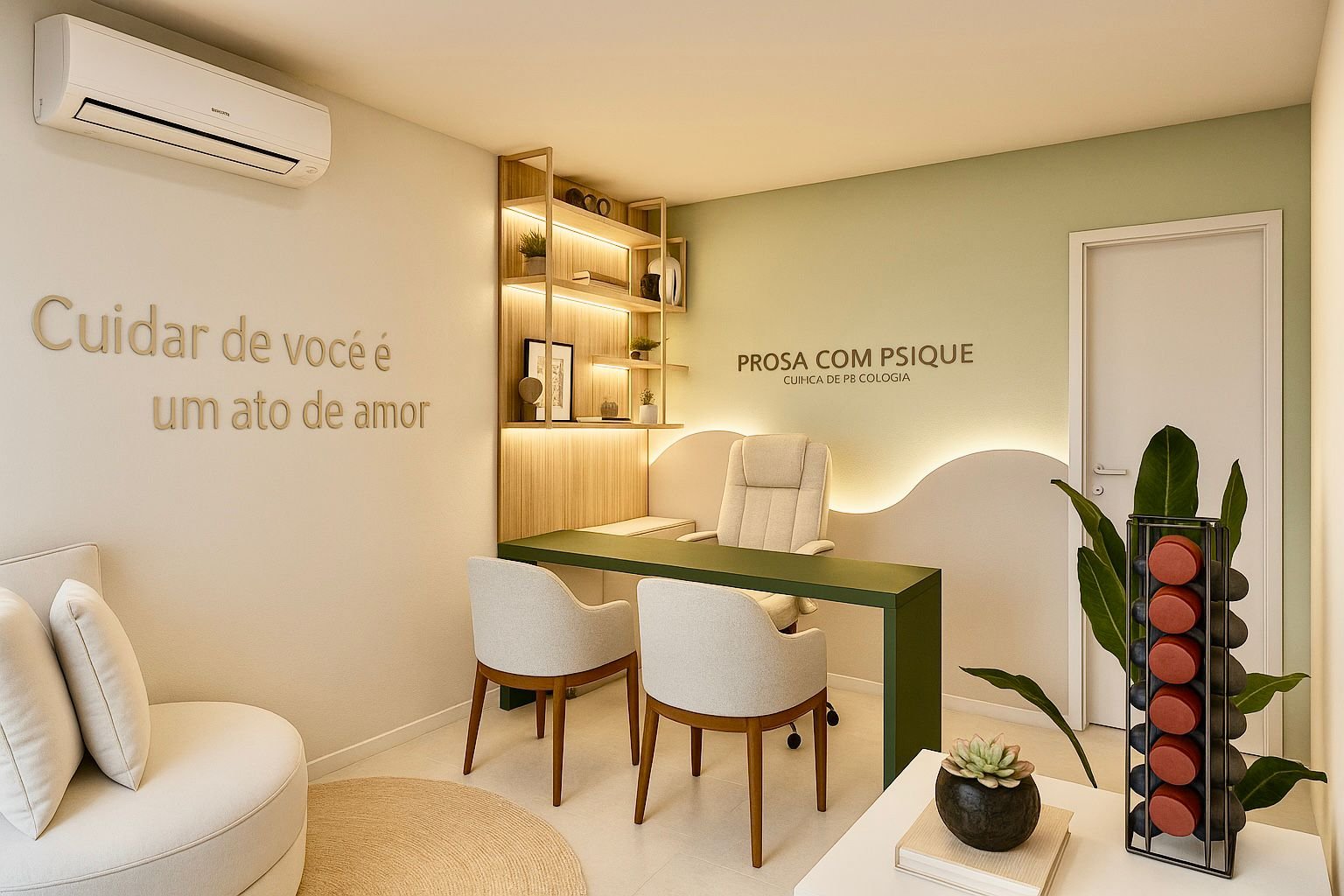 Cada detalhe deste consultório foi pensado para refletir, com sensibilidade, a identidade da clínica. O verde nas paredes foi escolhido estrategicamente por sua ligação com o equilíbrio e a serenidade, em harmonia com os princípios da psicologia das cores. Palavras distribuídas pelo ambiente reforçam a mensagem central da marca: cuidado, acolhimento e amor. Mais do que um espaço físico, este projeto materializa a essência da clínica — um lugar de escuta atenta, tranquilidade e transformação genuína.