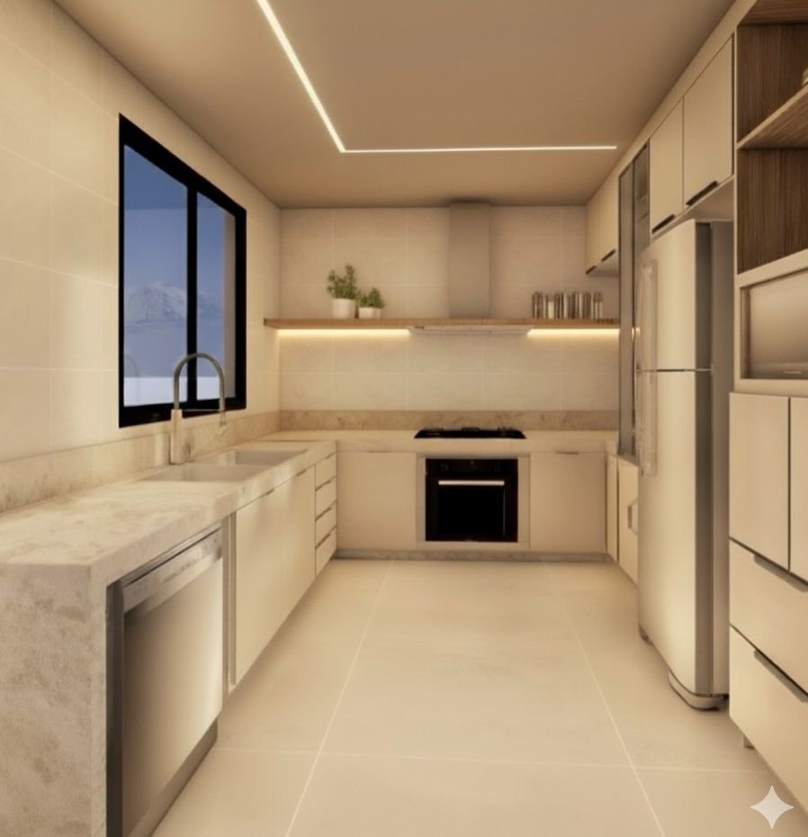 Este projeto foi uma reforma residencial com foco em modernização e funcionalidade. Reestruturamos completamente a cozinha, otimizando a disposição dos armários e eletros para um aproveitamento mais inteligente do espaço. Ampliamos a passagem entre a sala e a cozinha, promovendo maior integração entre os ambientes.