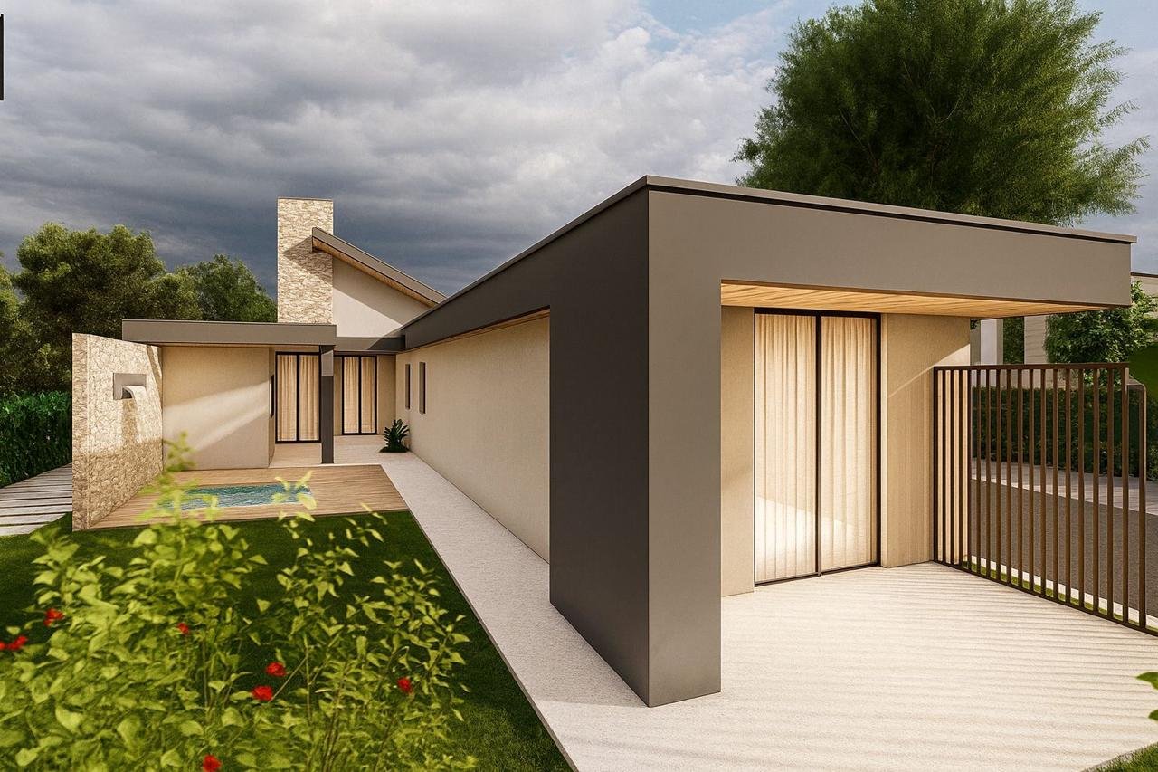 Este projeto se destaca pela forma e na composição. Com volumes geométricos, cobertura inclinada e uma distribuição assimétrica, a proposta rompe com os padrões tradicionais, revelando uma arquitetura autêntica e contemporânea.
