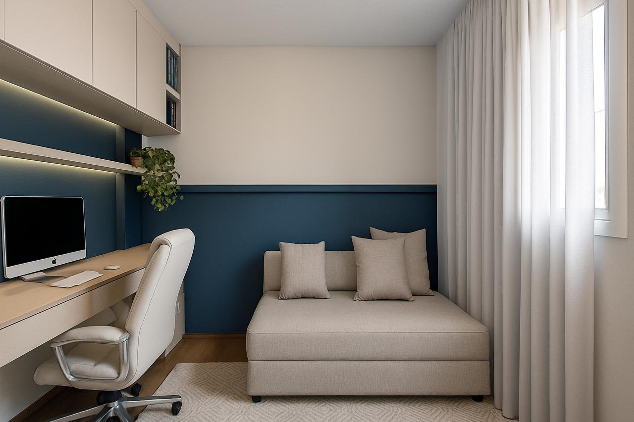 Para o home office, utilizamos a cor como recurso central para dar identidade ao ambiente, equilibrando estilo e concentração. Além disso, o espaço foi planejado para ser reversível, podendo se transformar em um quarto sempre que necessário, sem perder sua estética e praticidade.